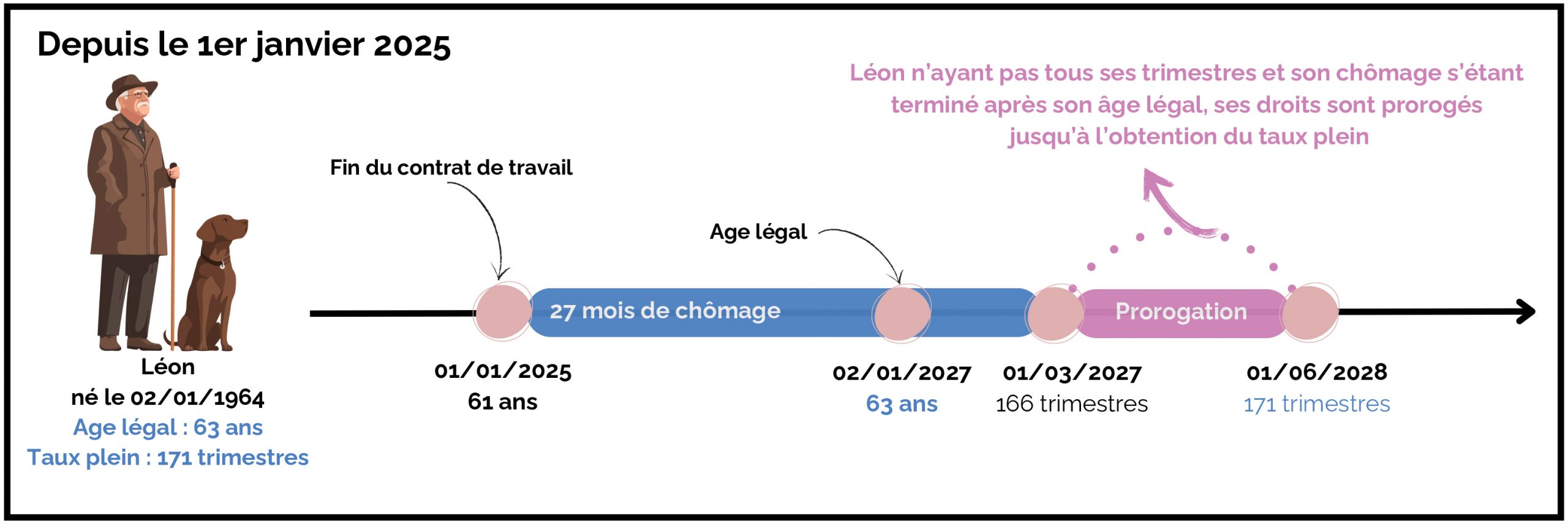 A la fin de son indemnisation, le 1er octobre 2027, il aura validé 169 trimestres. Cependant 171 trimestres lui sont nécessaires pour obtenir le taux plein selon son année de naissance.