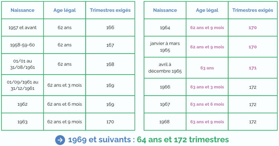 L’âge légal de départ dépend de votre année de naissance. Il se situe progressivement entre 62 et 64 ans.